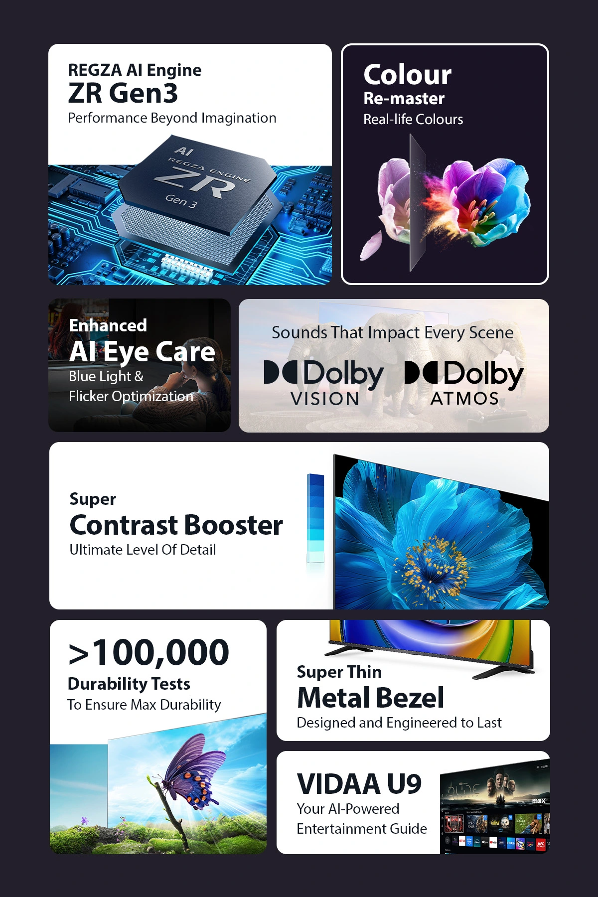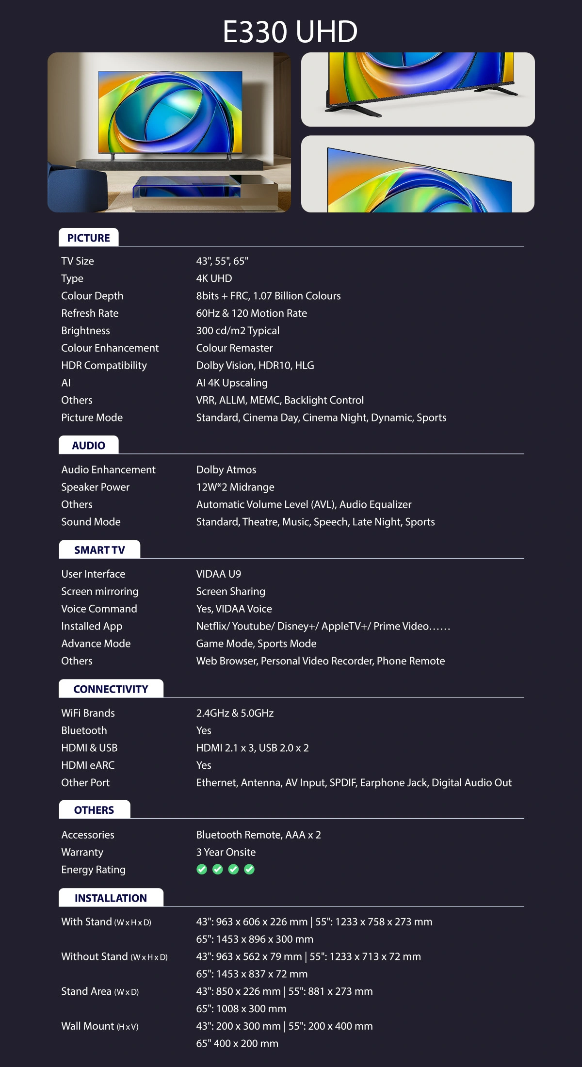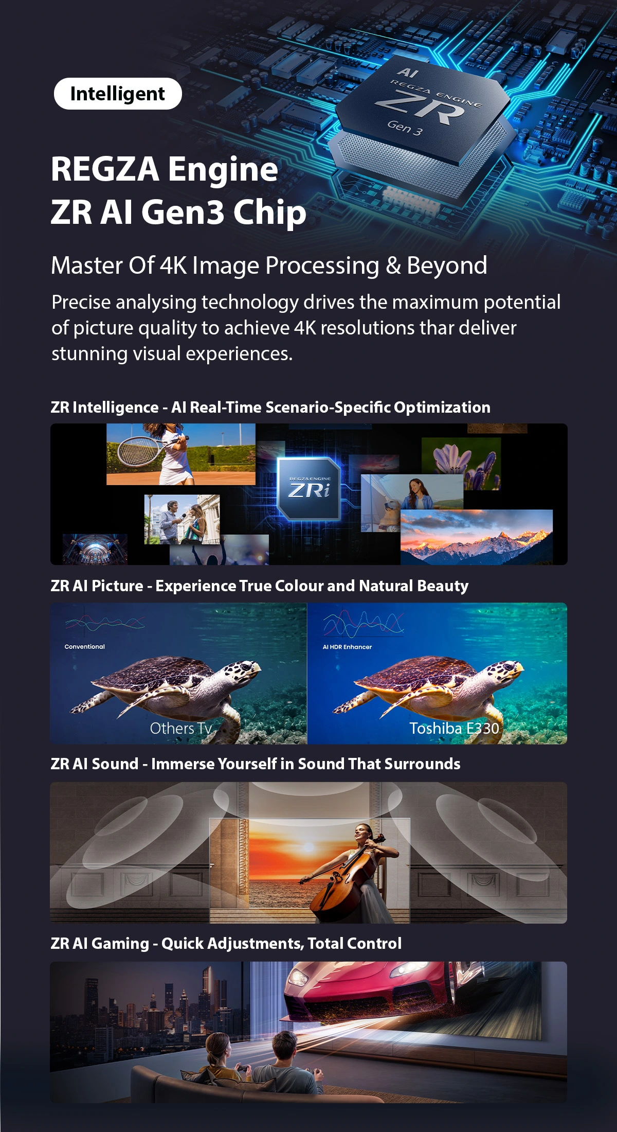 Dive into dazzling visuals with TOSHIBA E330RP 43″ 4K UHD SMART TV: Regza Engine ZR, Colour Re-Master, and Super Contrast Booster for vibrant colours and thrilling clarity in every scene!