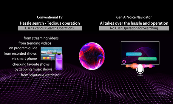 Traditional content search requires time-consuming manual operations to sift through multiple services or type precise queries. GenAI Voice Navigator simplifies this by learning user preferences through viewing habits and history, seamlessly searching across platforms. It handles search and filtering, understanding unclear requests like “a funny video to watch for 30 minutes” or “any trending comedy drama.” Equipped with radar sensing, the TV detects when a user is nearby and initiates a conversation, enabling true hands-free voice search. This innovation redefines content discovery, offering an effortless and intuitive viewing experience across services.